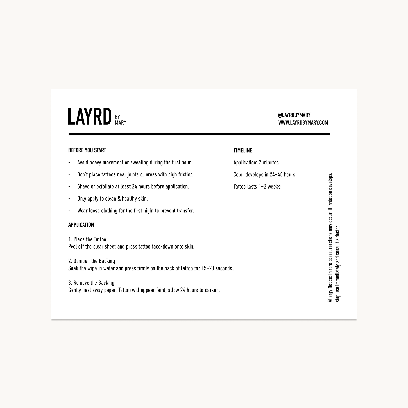 We also place an instructional manual on how to care for your tattoos and apply them on the back of each tattoo card.