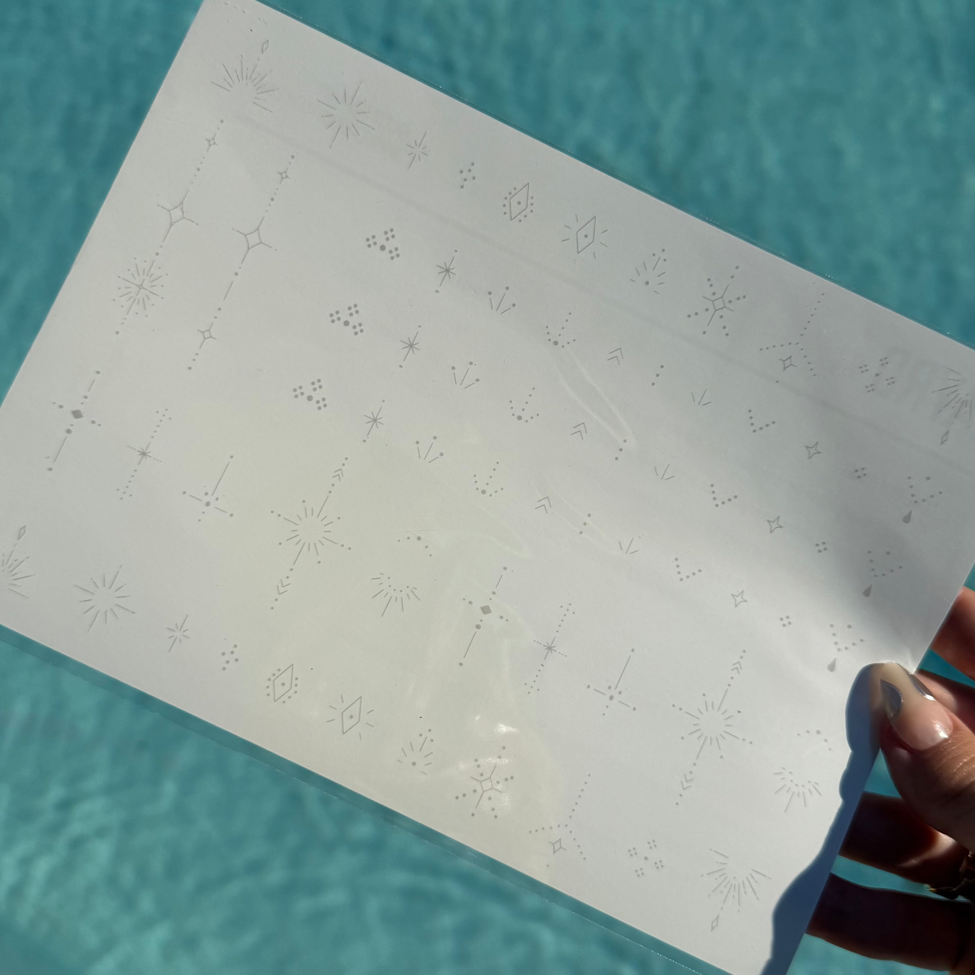 How to: Peel clear sheet and place face down onto skin. Soak with water and press for 15-20 seconds (the longer the better). Watch the tattoo develop from clear to black in 24-48 hours! Do not get the tattoo wet for the first 8 hours, and be sure to cover with clothing for the first two nights (as the ink remains active for 48 hours and can transfer on other areas of the skin).